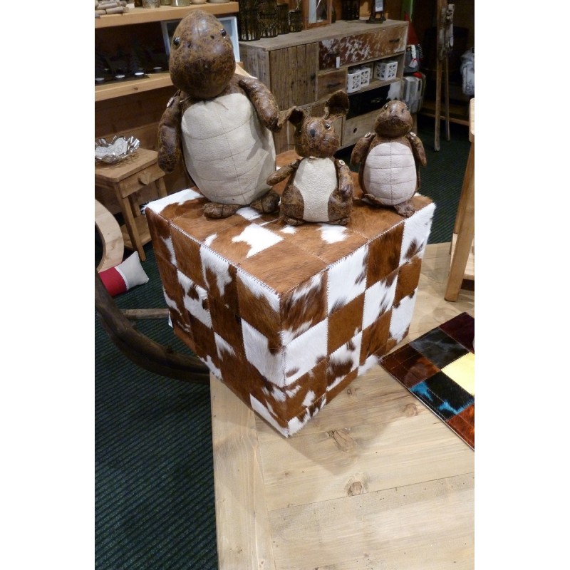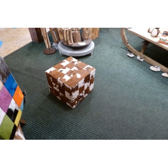 Pouf en peau de vache naturelle, carreaux de 10x10, très confortable.