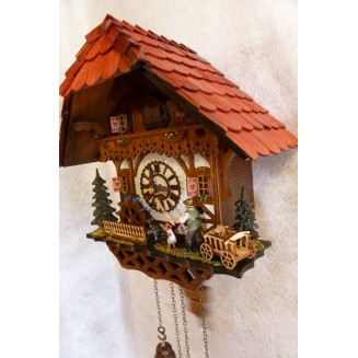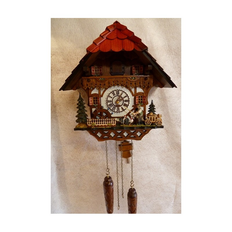 Le coucou sort et vous annonce l'heure indiquée (1h 1 coucou, 2h 2 coucous, etc...), suivi d'une mélodie et la mise en route des automates (la roue tourne, le fermier secoue son balai au dessus des poules)