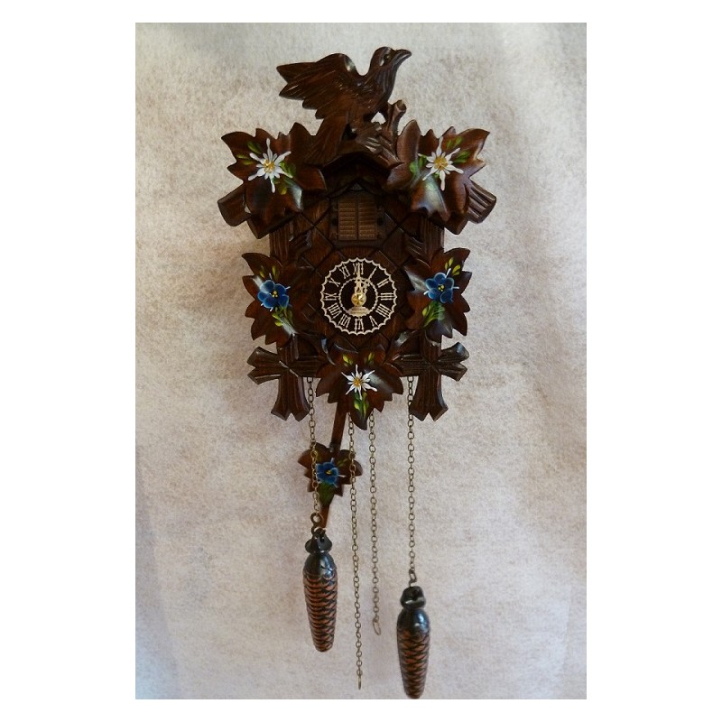 Coucou traditionnel de la Forêt Noire, musical, décoré de magnifiques edelweiss et gentianes.