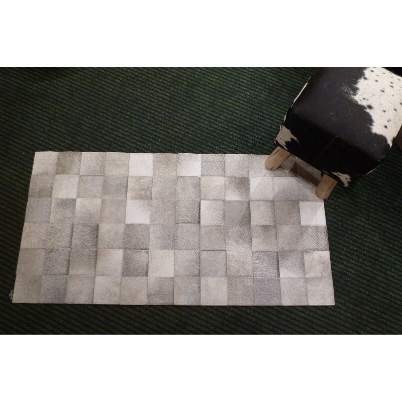 Tapis en peau de vache, confectionné en style patchwork, couleur naturelle poivre et sel (Gascogne).